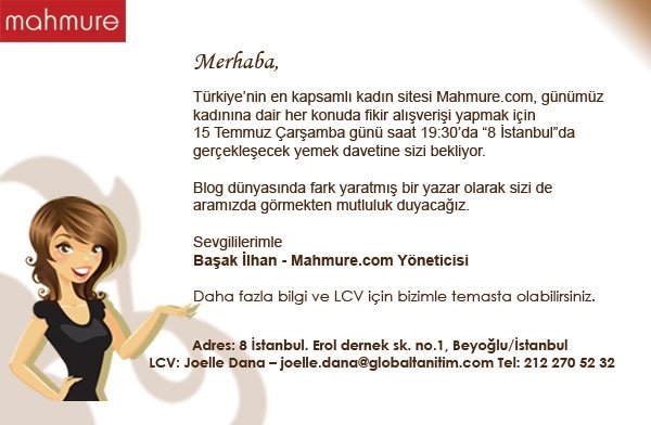 Az evvel friendfeed’de rastladığım daveti paylaşmak istedim. Mr. Big köşesi açıldığından beri takip ettiğim mahmure.com sitesi blog yazarları ile tanışmak sohbet etmek için bir akşam yemeği düzenliyor. Yemeğin konusu ise kadınlar ve mahmure sitesiymiş.