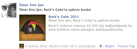 Basit iş görür motivasyonu yüksek işleri seviyorum. Coca Cola’da Rock’n Coke etkinliğini duyurmak için basit bir kurgu geliştirmiş. Sizden etkinlik alanına sanal çadır kurmanız isteniyor. Şayet bunu 10.000 kişi yaparsa etkinliğe katılacak sanatçıların isimleri açıklanıyor. Şu ana kadar 13 sanatçı açıklanmış. İnsanlar paylaştıkça sayı artacak gibi duruyor.